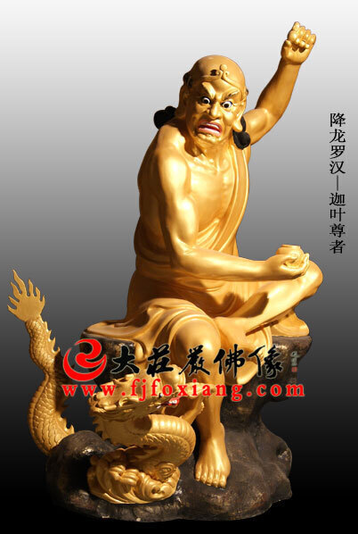 迦叶尊者也被称为“降龙罗汉”,是佛教十八罗汉中的第十七位。这一称号源于民间传说中他降伏龙王、取回佛经的殊胜功德。据传在古印度,那竭国曾遭龙王作乱,洪水肆虐,龙王还将佛经藏于龙宫,使佛法难传。身为佛祖座下高徒的迦叶尊者挺身而出,以无上法力降服龙王,成功取回佛经,护持正法,因此被尊称为“降龙尊者”。
